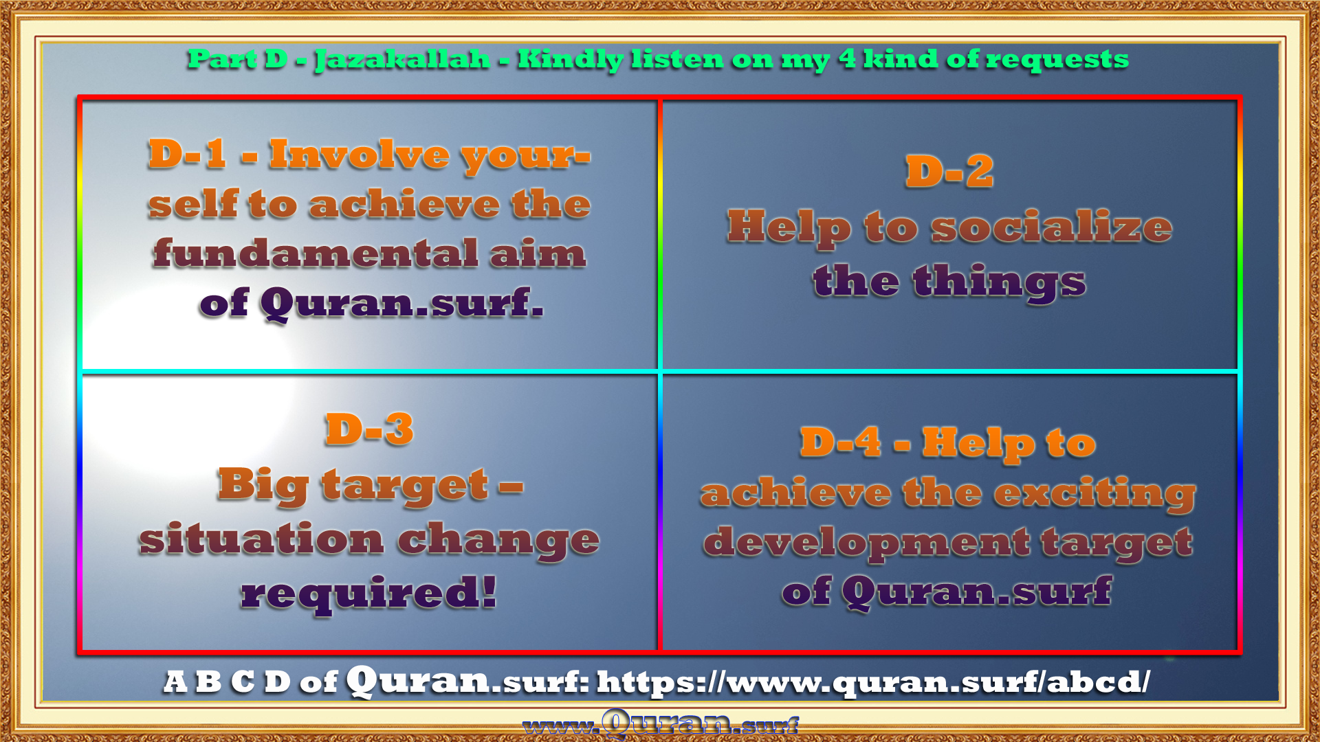D-1 Kindly involve yourself to achieve the fundamental aim of Quran.surf.
